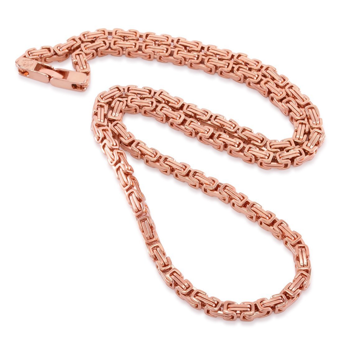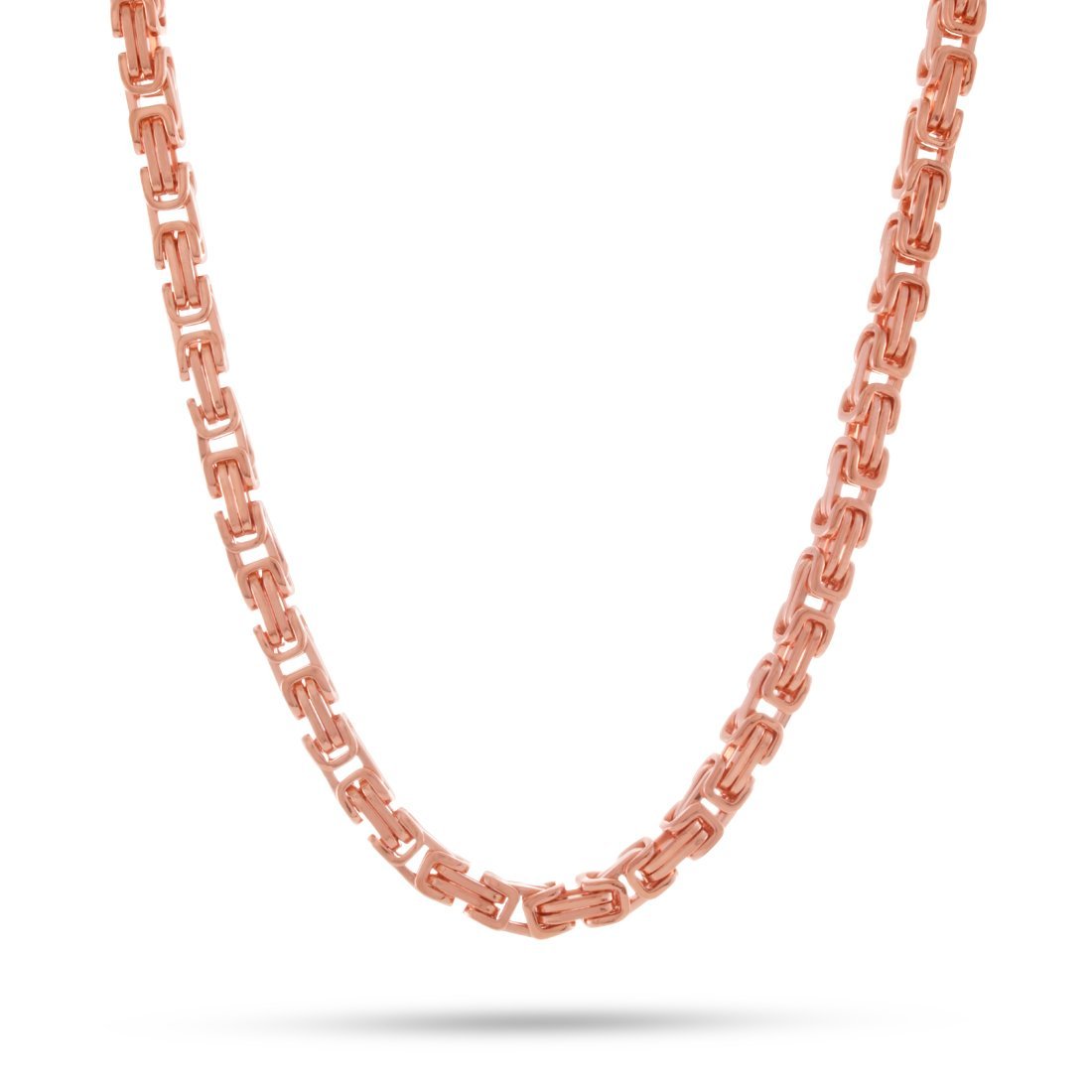 Check out this 5mm men's bike chain designed by King Ice. It features a Rose gold-ionic plating with a high-polish finish and a fold-over clasp. This 5mm chain comes in different lengths. The King Ice logo is engraved on the clasp.