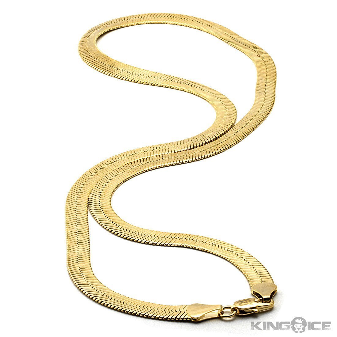 Herringbone chains also known as the flat chains goes back to ancient Egyptian times that shows sophistication with its design. Designed to mimic the bones of the herringbone fish with parallel and slanted bones. Also, one of 2 Pac's favorite. This herringbone chain features 14K gold plating and a box clasp closure. Laser engraved King Ice logo on clasp. *NOW AVAILABLE WITH FOLD-OVER CLASP*