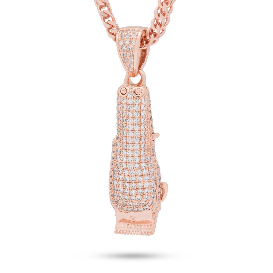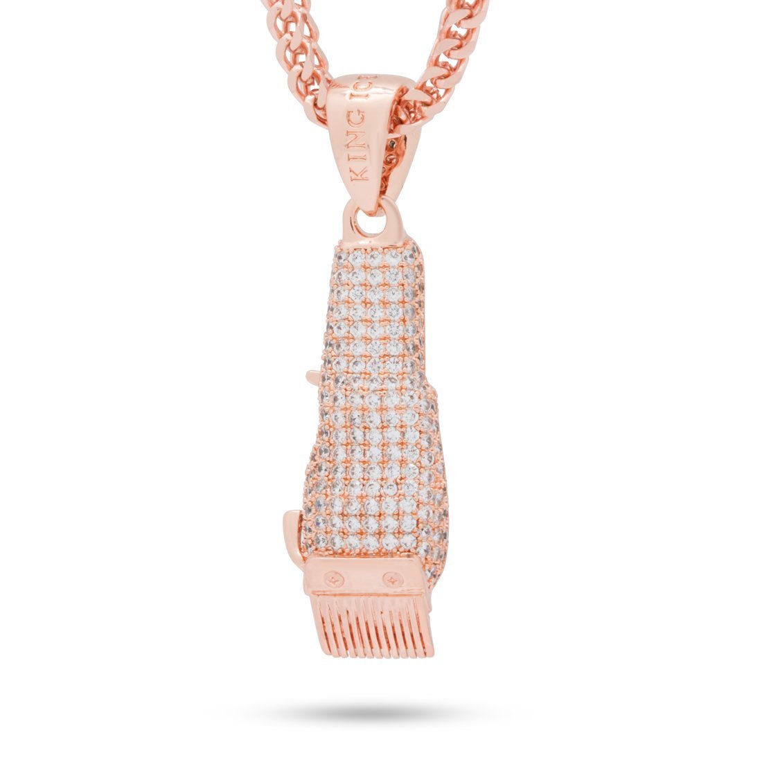 King Ice pays tribute to barbers and their craft with the Barber Shop Clippers Necklace. This piece is iced with VVS Diamond Simulate stones and comes in 14K Gold Plating, white gold plating, and rose gold plating. Each piece features a 2.5mm, 20" Stainless Steel Franco chain to provide it's iconic look.