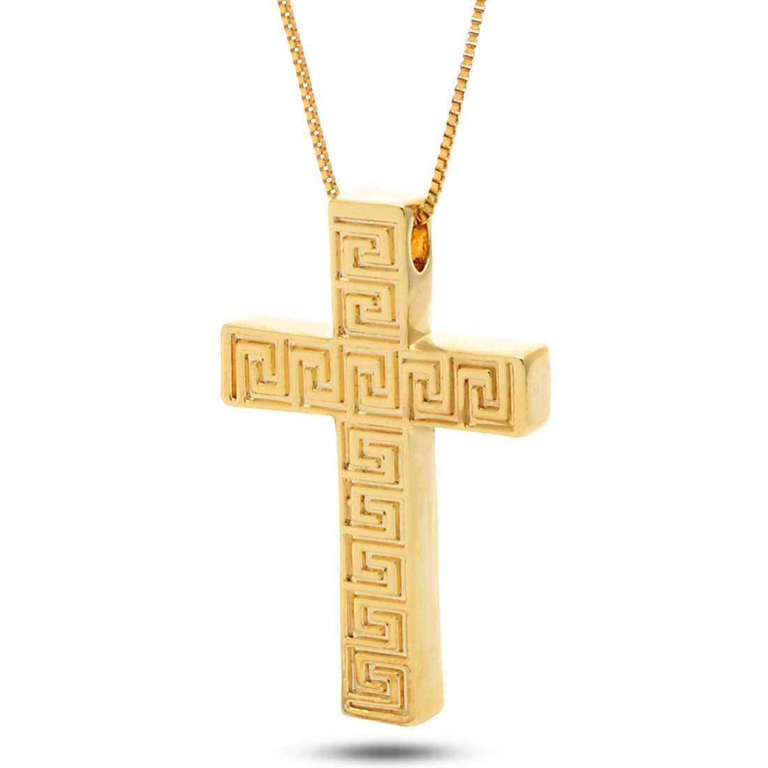 Greek key decorations earn their reputation as a meander decoration because it takes a single continuous line to create a design. Now, this 14K Gold Greek Key Cross carries on that tradition, fusing a meander decoration with religion to create this gold plated cross. Made from solid brass, this cross features elegant twists and turns thanks to its Greek Key exterior, while its smooth edges pair nicely alongside a 24", 1mm box chain.
