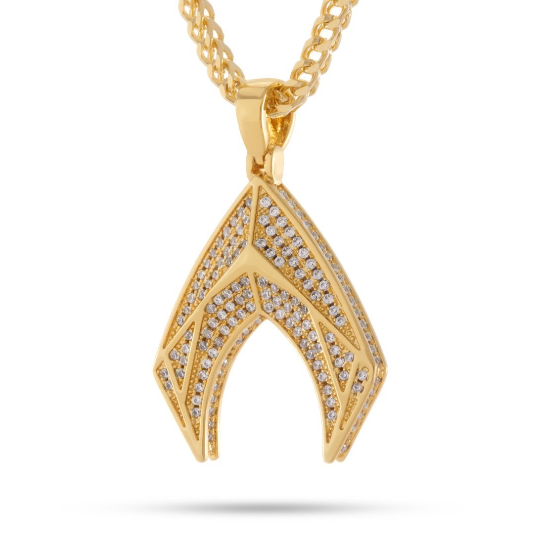 As the master of the sea, Aquaman remains a feared foe for anyone who enters his domain. His logo represent the strong and powerful trident that comes iced and dipped in 14K gold and included with a 14K 2.5mm 26" gold stainless steel Franco chain.