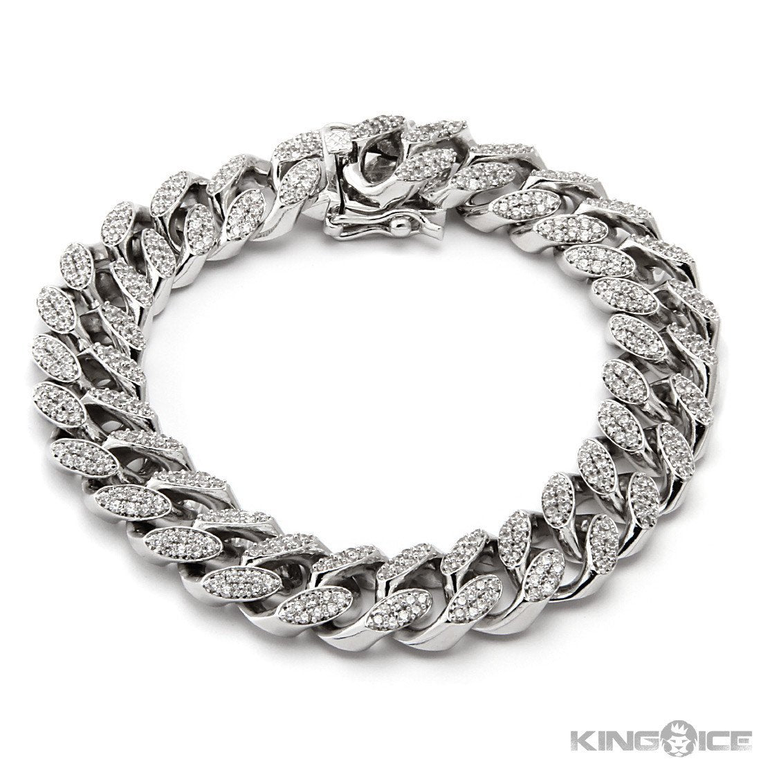 King Ice presents to you a Cuban curb chain bracelets that features a rhodium silver plating with stunning clear CZ micro pave set by hand on each chain link. This piece will be secured around your wrist with a box clasp and double safety. Measures 15mm in width with a 8" length.