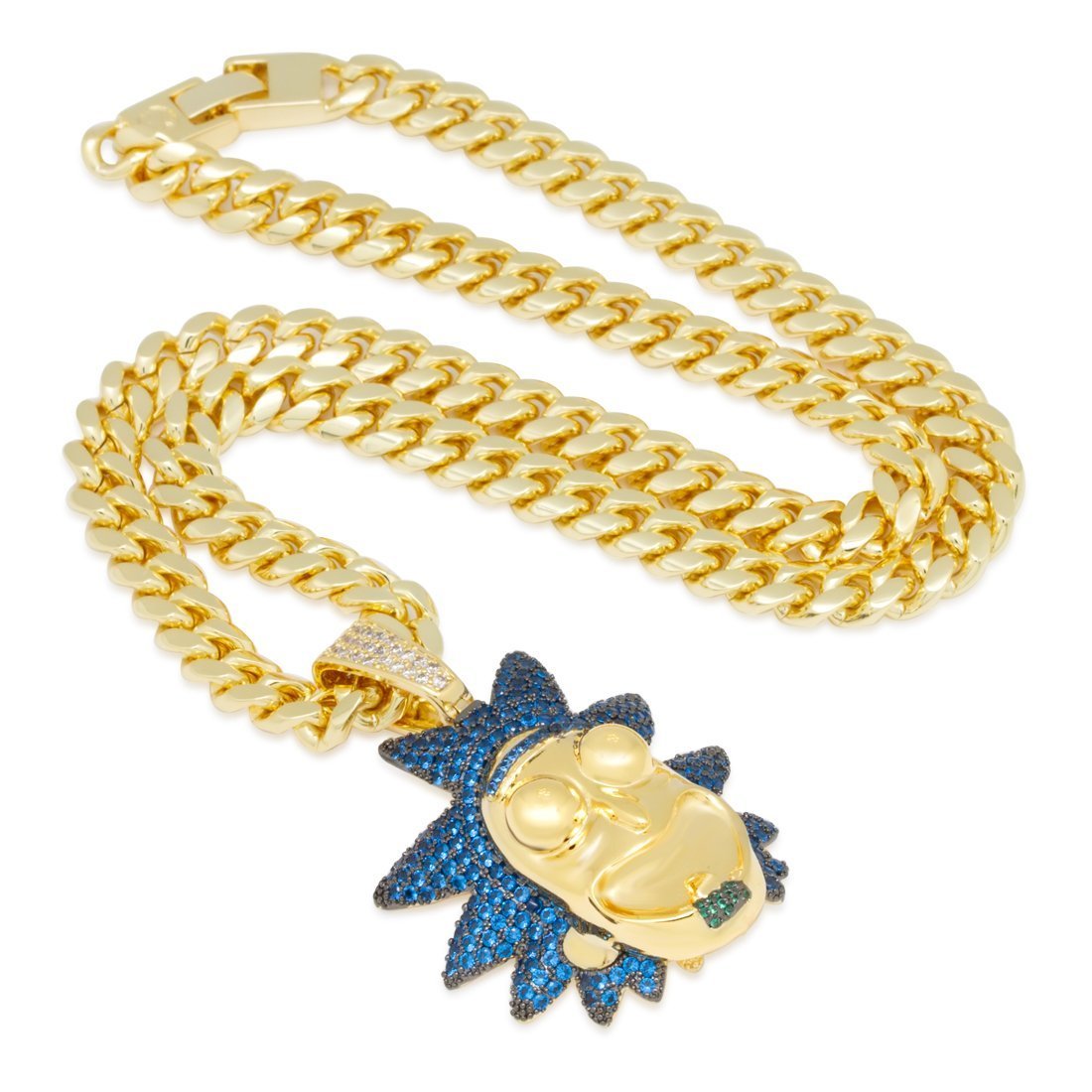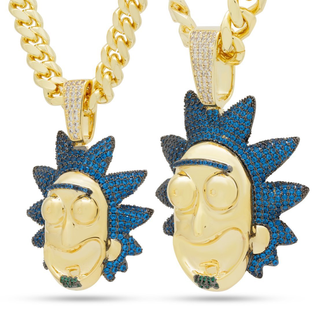 The Good Rick pendant showcases the mad scientist in aquamarine VVS Diamond Simulate stones and 14K Gold plating for a vibrant display. The 3D design provides that excitable and crazy grin of Rick that viewers know. The small size pendant is paired with an 8mm, 20" Miami Cuban chain, while the large pendant comes with a 12mm, 24" Miami Cuban chain.