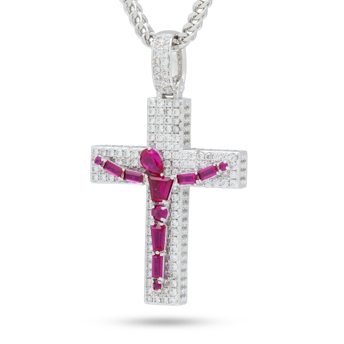 The magenta stones are a pleasant contrast to the white gold plating on the iced crucifix cross necklace. Magenta stones color the body while clear VVS Diamond Simulates cover the entire cross. INRI is lightly engraved on the back of the cross to finish off the last details. Each necklace is plated with a white gold finish and comes with a 2.5mm, 20" Franco Chain.