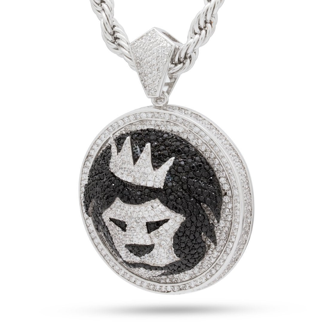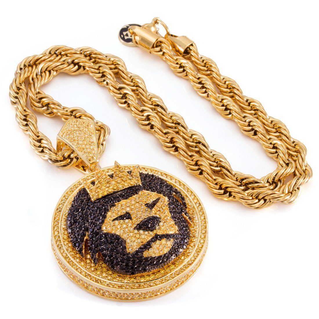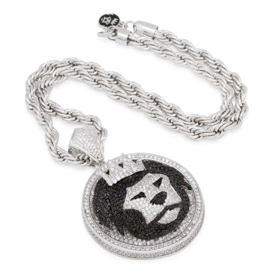 Our Magnus Lion Necklace stands out with its 3D design, iced with handset VVS Diamond Simulate stones. This piece is available plated in 14K Gold or White Gold. Each pendant is paired with an 8mm, 24" stainless steel rope chain.
