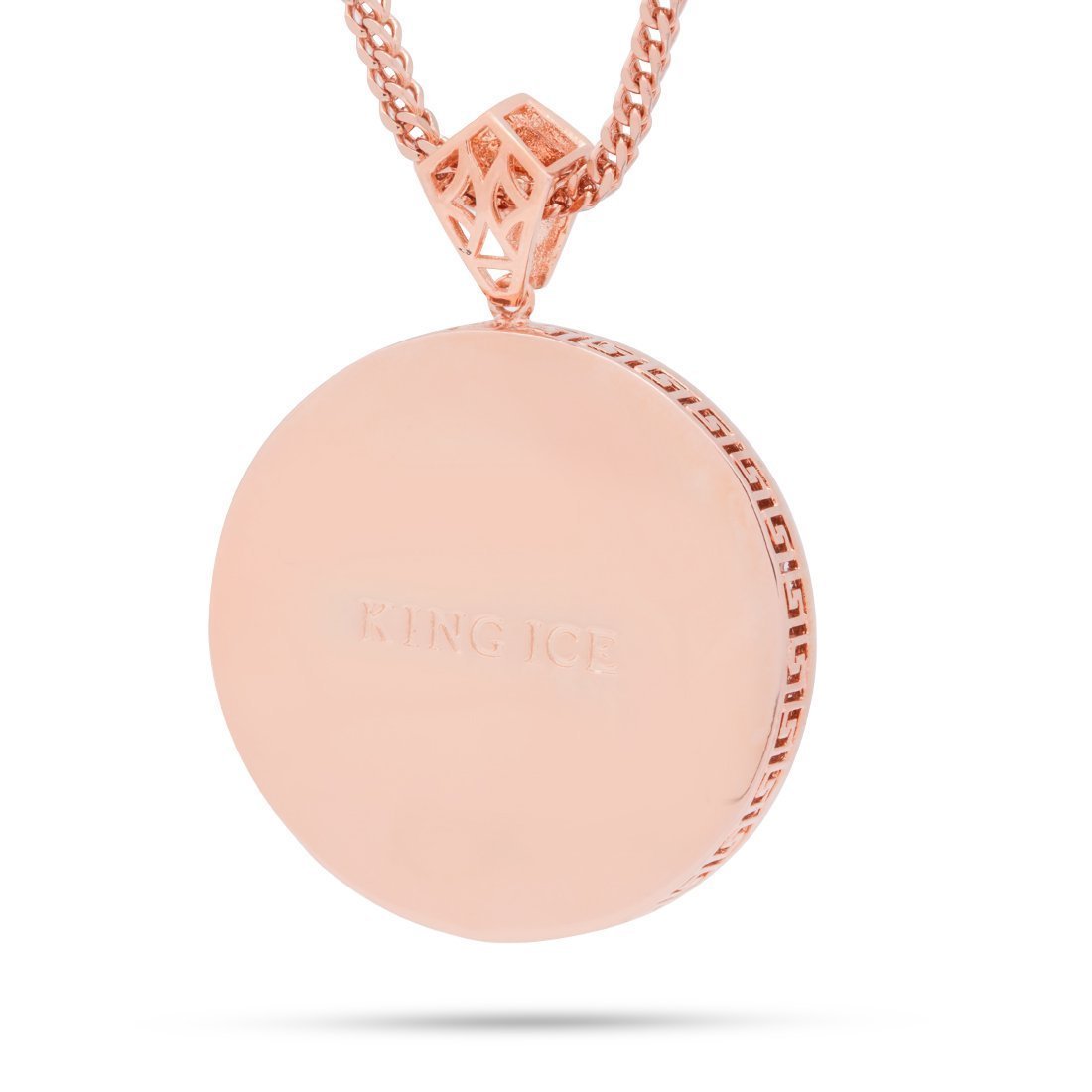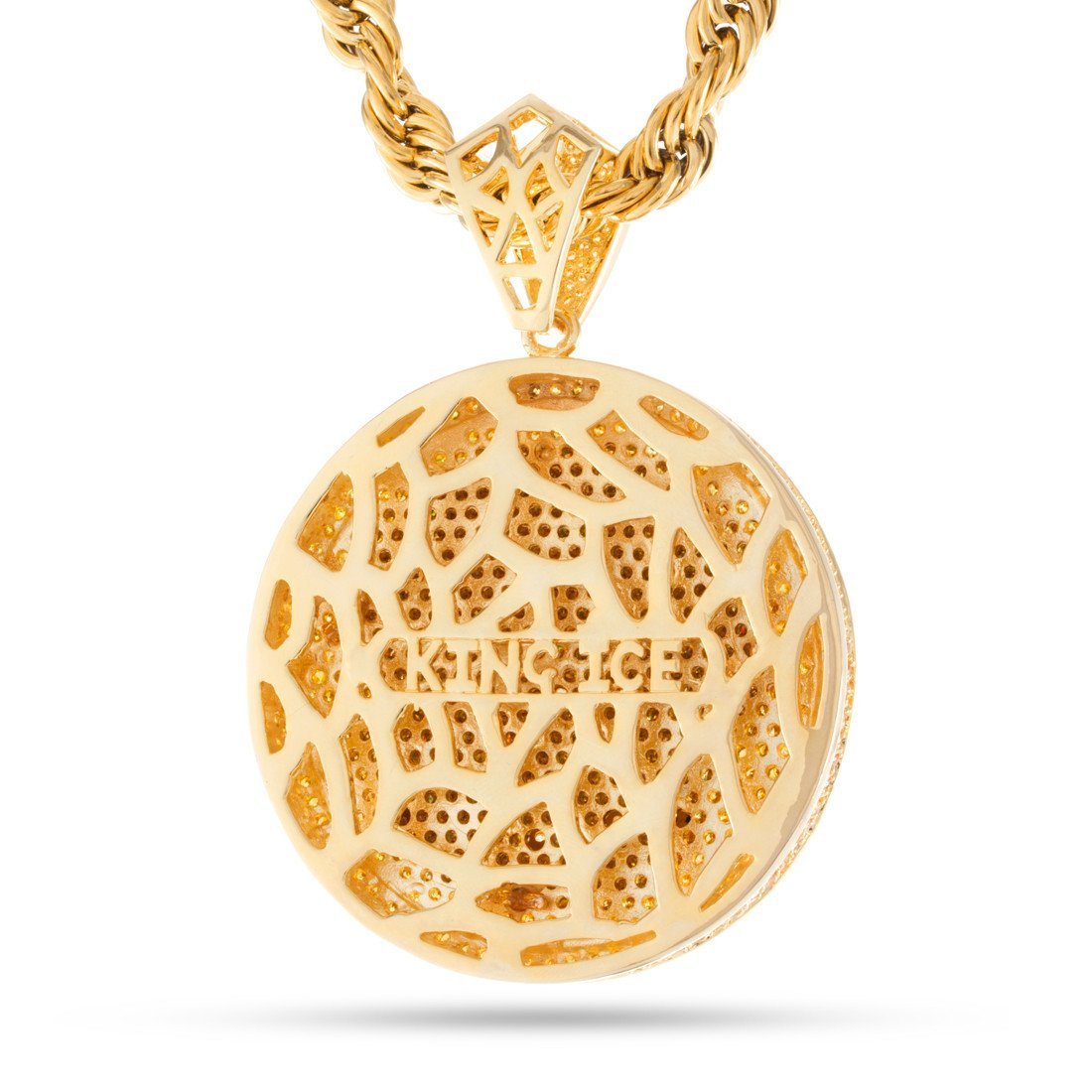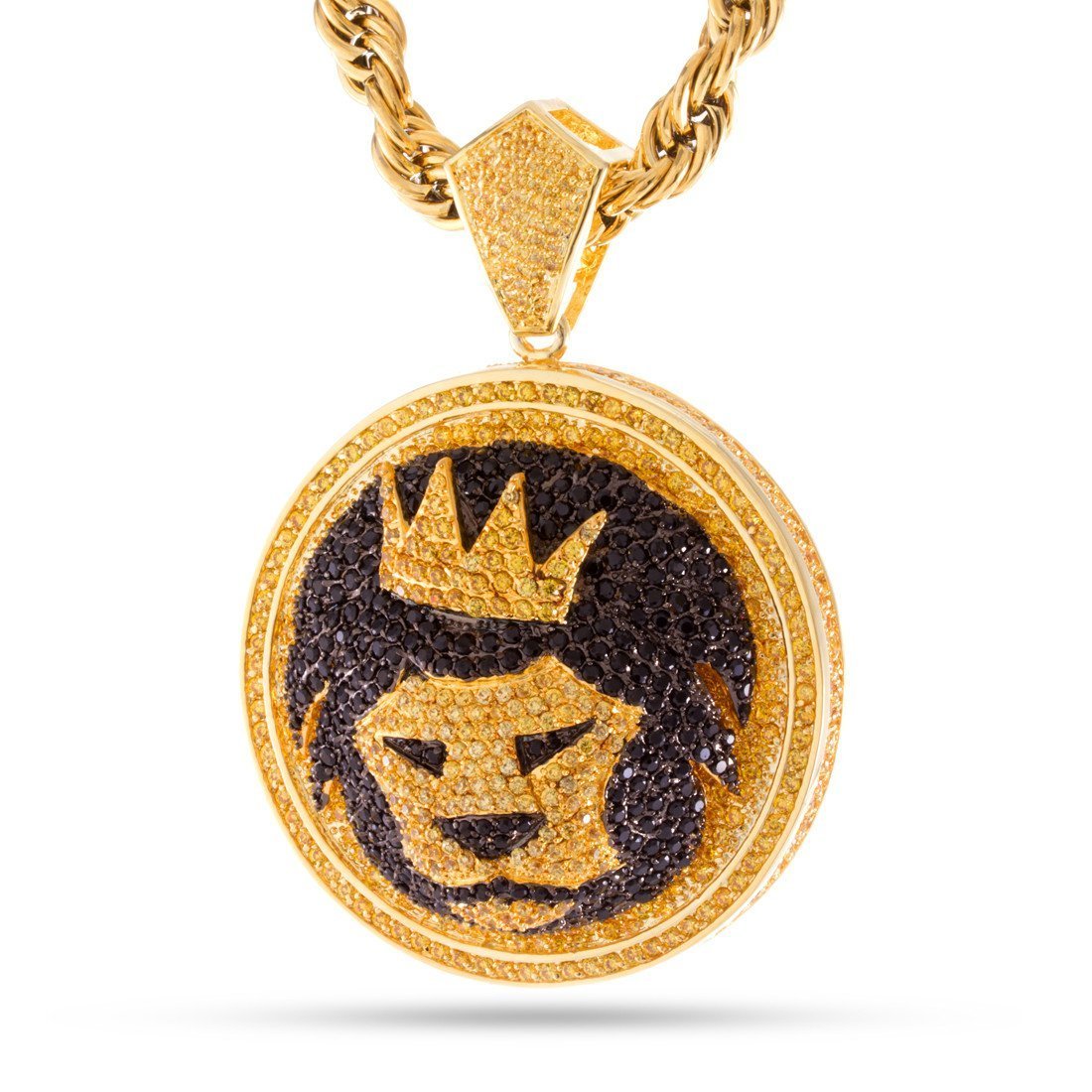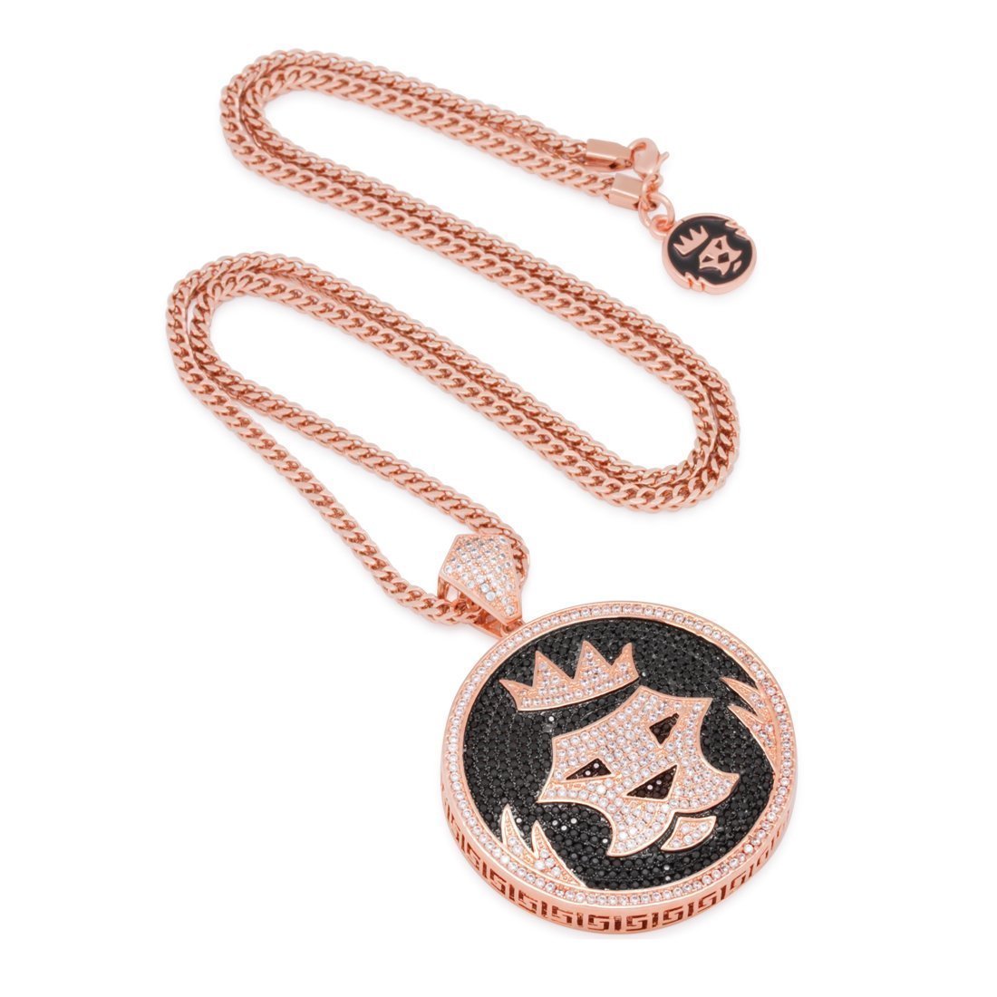 Our Magnus Lion Necklace stands out with its 3D design, iced with handset VVS Diamond Simulate stones. This piece is available plated in 14K Gold or White Gold. Each pendant is paired with an 8mm, 24" stainless steel rope chain.