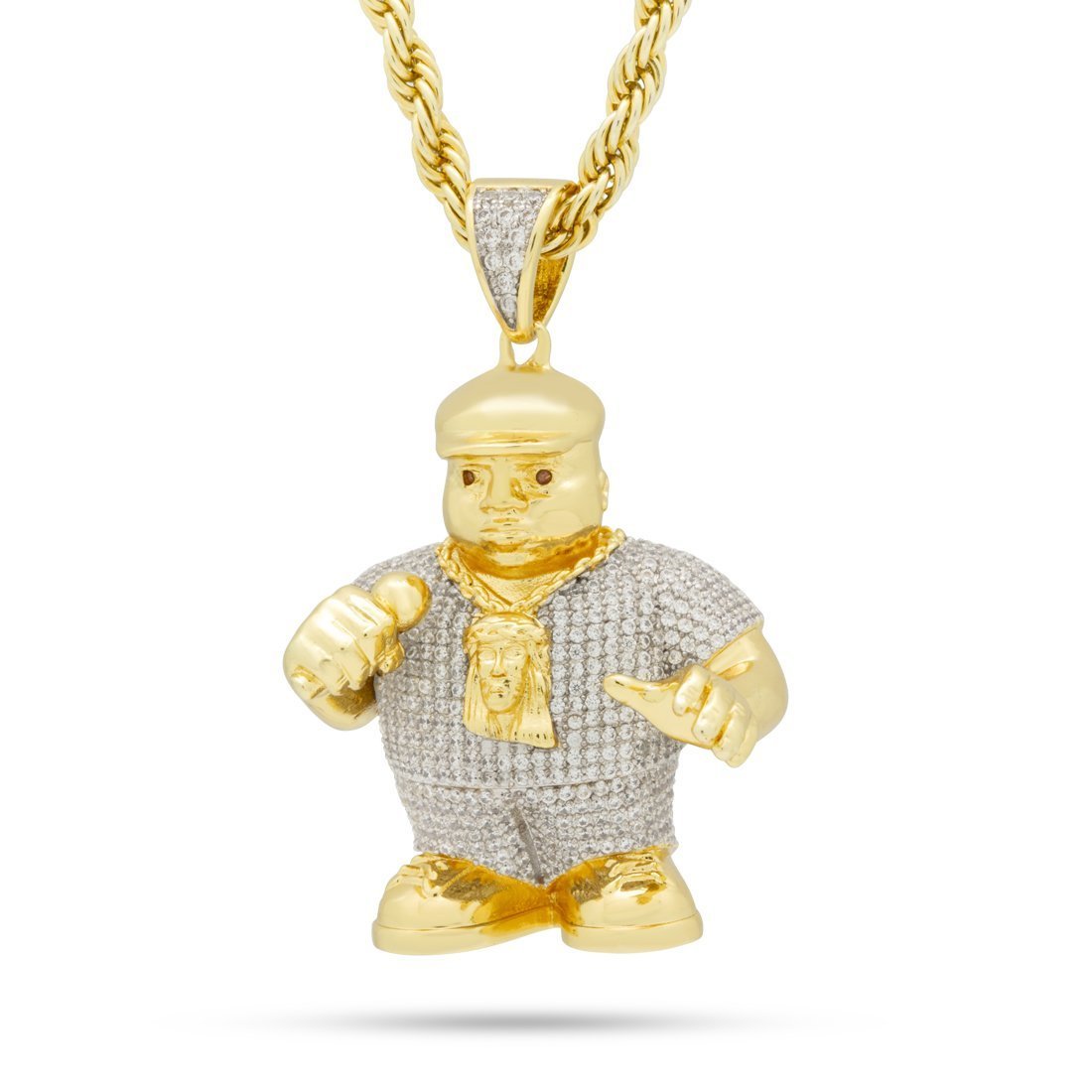 Armed with a mic and a large Jesus piece, the Biggie Smalls necklace emulates the identity of the late hip hop legend in 3D. As part of the official Biggie Collection, each piece is made with the highest quality of 14K Gold plating and lab diamonds available to best exemplify our status in street wear jewelry. Each piece is paired with a 4mm, 26" Stainless Steel Rope chain.