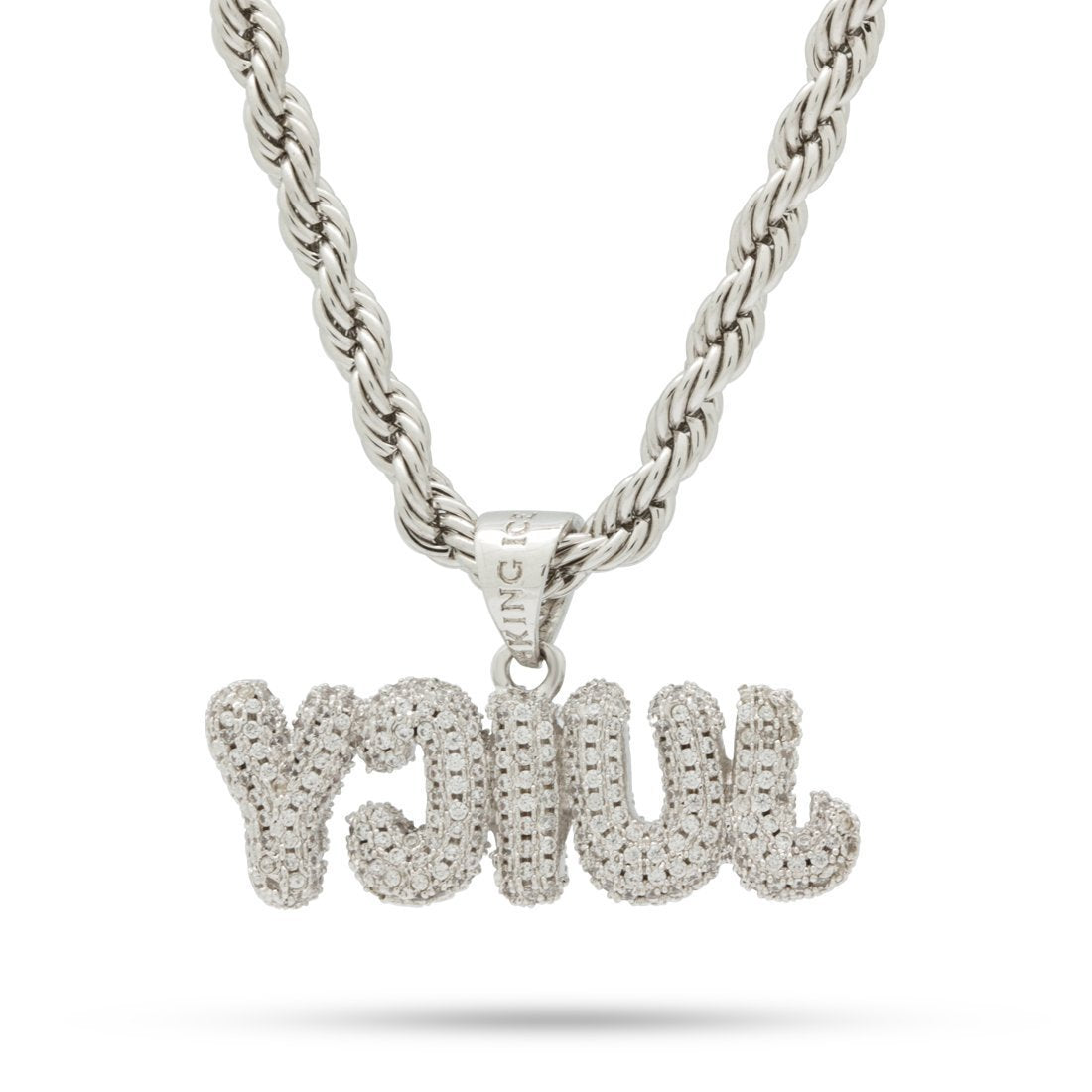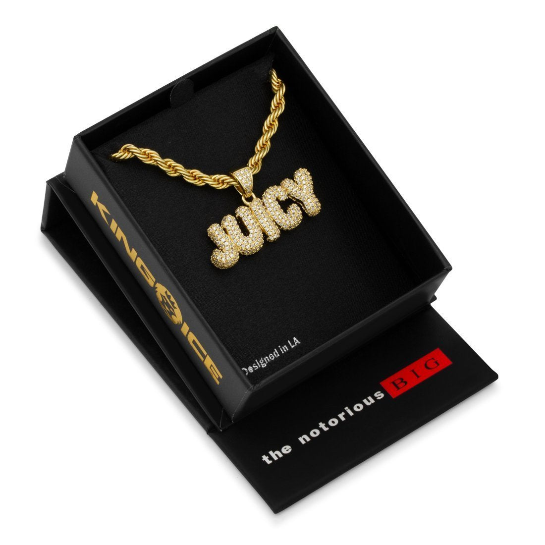 The Juicy piece is dedicated to Biggie's first hit single from the album "Ready to Die." Its regarded as one of the greatest hip hop songs of all time. Each bubble letter is finished with 14K Gold plating or white gold plating and handset CZ stones on both ends. A 4mm, 26" Stainless Steel Rope chain is paired with each necklace.