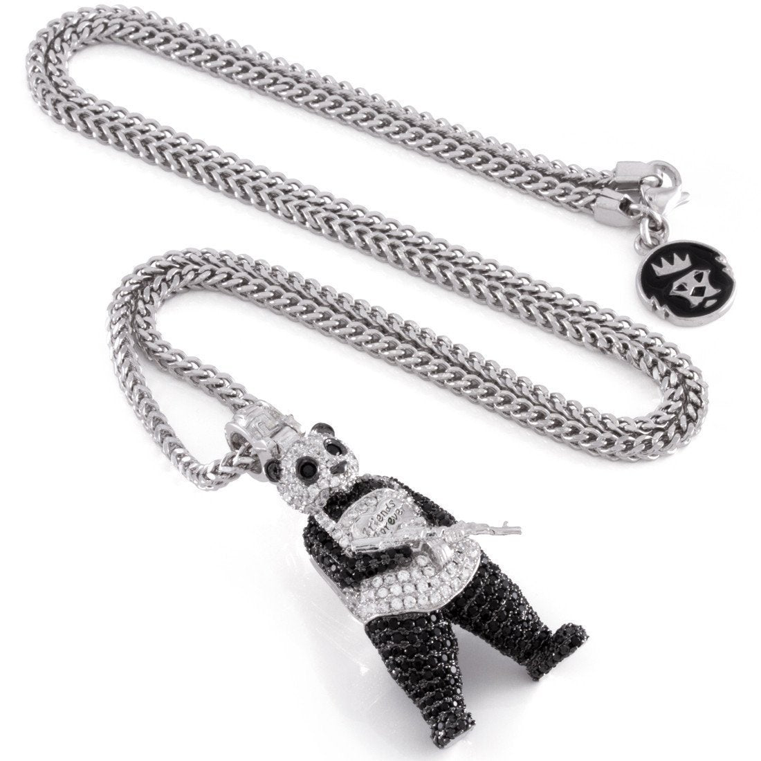 The iconic Joker henchmen, Panda Man may look friendly and loveable, but equipped with an automatic rifle, he’s everything but friendly. Each White Gold piece uses AAA, handset stones to define his look, while its detailed AK-47 assault rifle replicates the deadly accuracy of one of the most destructive weapons in history. Each Panda piece uses white gold plating and includes a 2.5mm, 20” stainless steel Franco chain.