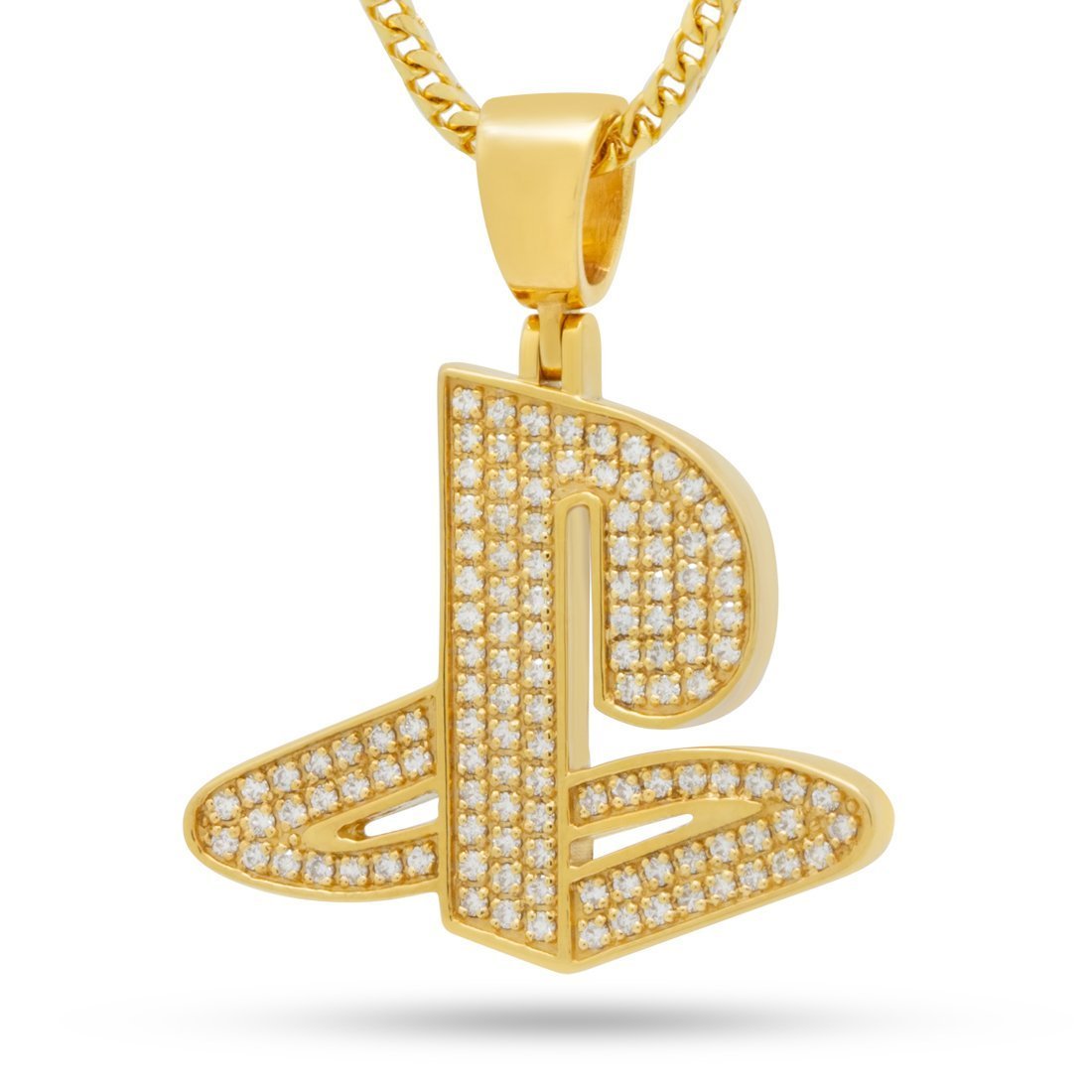 The original PlayStation® logo is unmatched for its classic design. The new Solid 14K Gold Iced necklace uses genuine round cut SI 1 diamonds to re-capture the popular emblem. The round diamonds offer a cleaner look than the original colorful logo, which opts for a subtle look. The solid 14K Gold adds a luminous and heavy feel to the pendant. Each PS logo is paired with a solid gold 2mm, 20" Franco Chain. Each piece is made to order with a two week turn around.
