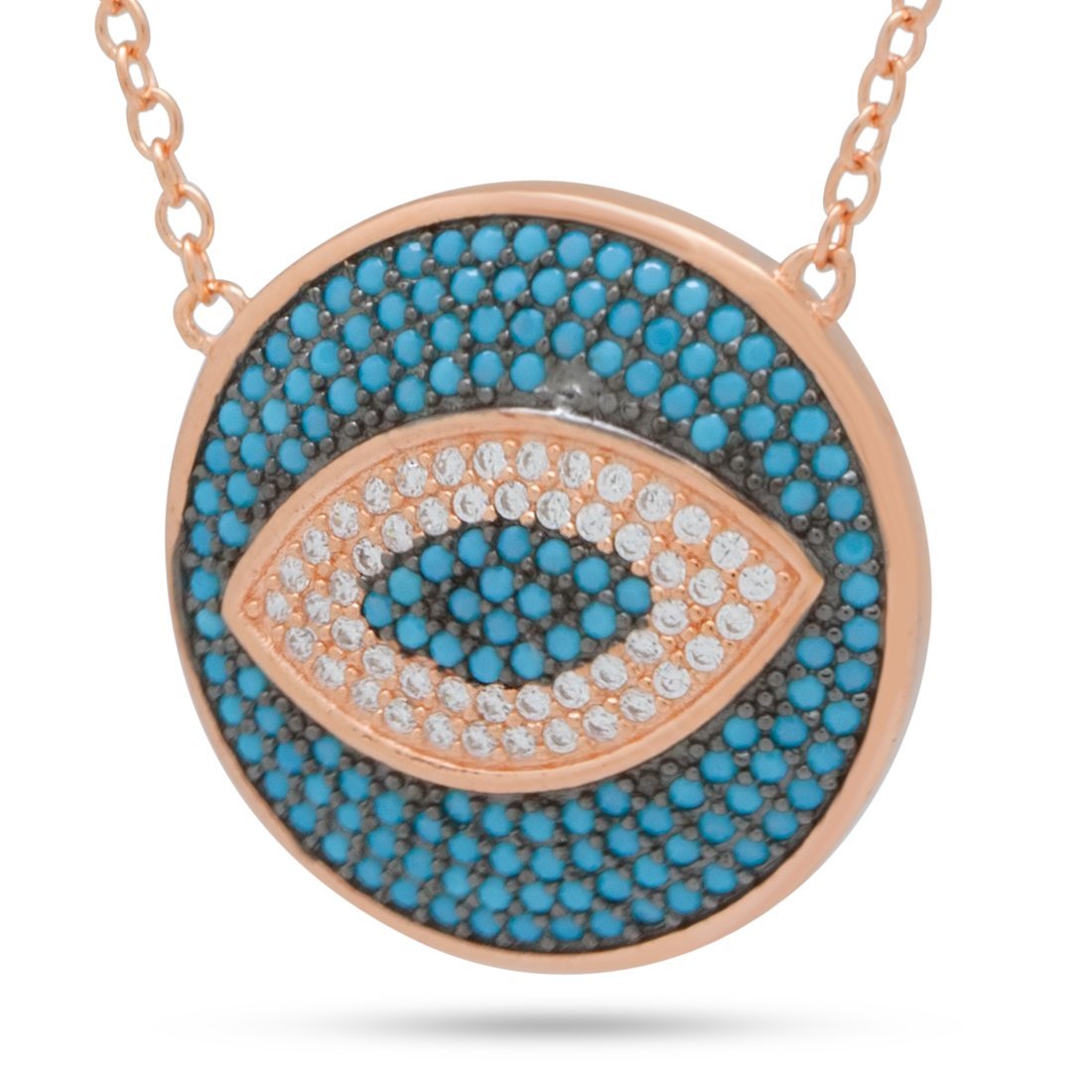 Legend has it the evil eye warns off malevolent stares when one isn't aware. Although there are different colors for evil eyes, the light blue turquoise grants protection, solitude and peace. It also serves as a means of broadening your perspective. Each evil eye is decorated with clear VVS Diamond Simulates and turquoise stones. The evil eye pendant comes with an attached 1mm, 17" Cable Chain that hangs from the top. Each necklace is finished with rose gold plating and made out of .925 Sterling Silver.