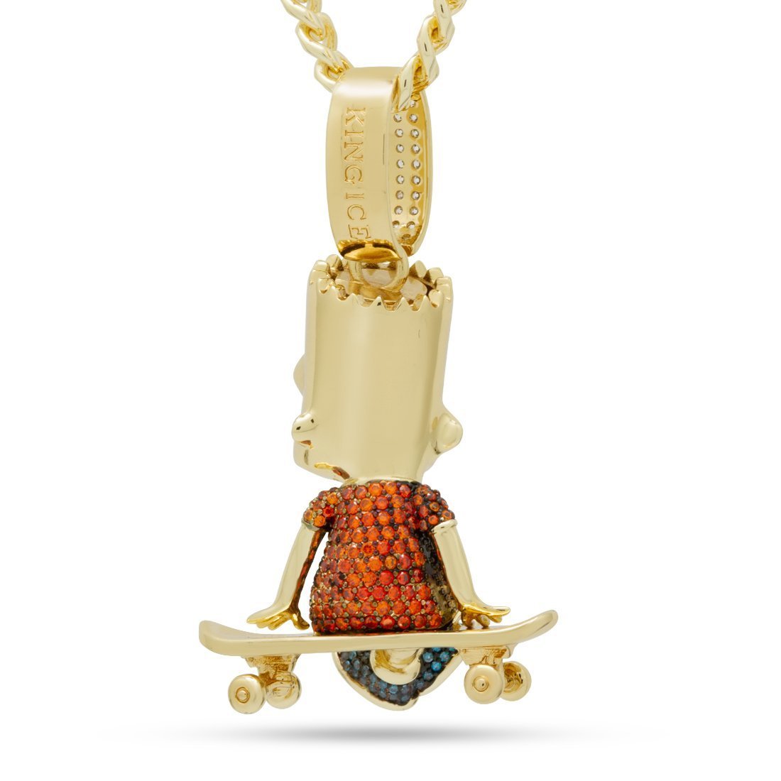A new addition to the official Simpsons x King Ice collaboration, the Skater Bart Necklace has a 3D Bart Simpson relaxing on his skateboard. His clothing is iced with orange and blue lab created diamond simulates. The large bail is iced with even more stones. Each pendant is paired with a 5mm, 20" Miami Cuban chain. The piece is available in 14K Gold plating and white gold plating.