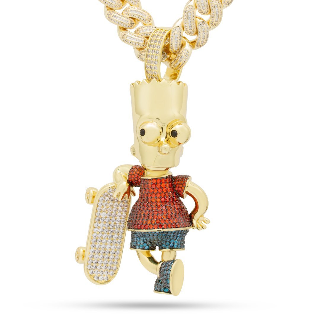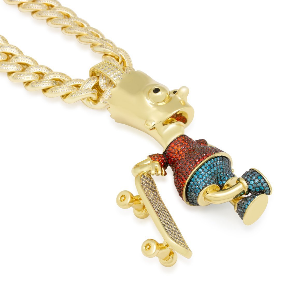 A new addition to the official Simpsons x King Ice collaboration, the XL Cruiser Bart Necklace has the original 3D design of Bart with his skateboard. Bart is iced with more than 800 colored lab created diamond simulate stones to compliment his familiar outfit. The pendant comes with an 18mm, 20" Iced Miami Cuban chain with more than 2,700 CZ stones. The chain has a custom Greek Key push down clasp with more CZ stones.