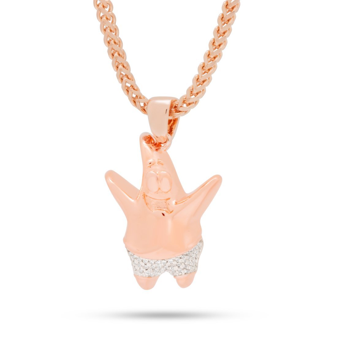 From his memorable quotes and lovable laugh, Patrick is remembered for causing shenanigans in Bikini Bottom with his best friend SpongeBob SquarePants. The long running show on Nickelodeon is now collaborating with King Ice to bring officially Patrick to street wear jewelry. Each piece is finished with 14K Gold plating, White Gold plating or Rose Gold plating. Patrick's shorts are covered with CZ stones. Each pendant is paired with a 2.5mm, 26" stainless steel Franco chain to capture his vibrant, iconic look.
