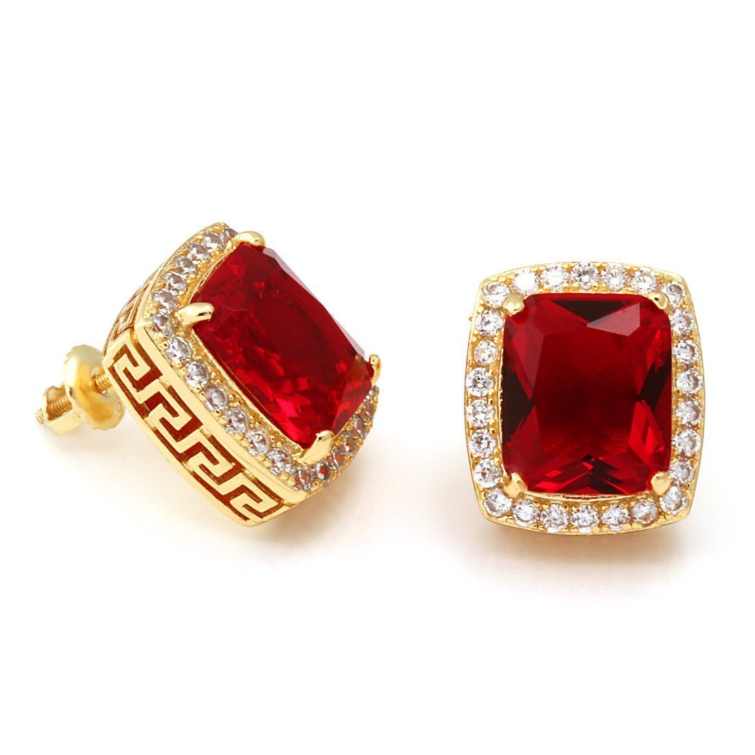 With a ruby stone big enough to catch your eyes' attention, the Crown Julz earrings are outlined with a single row of clear VVS Diamond Simulates. A Greek Key design borders the earrings for a thick set look. The earrings are plated in a 14K gold or white gold finish.