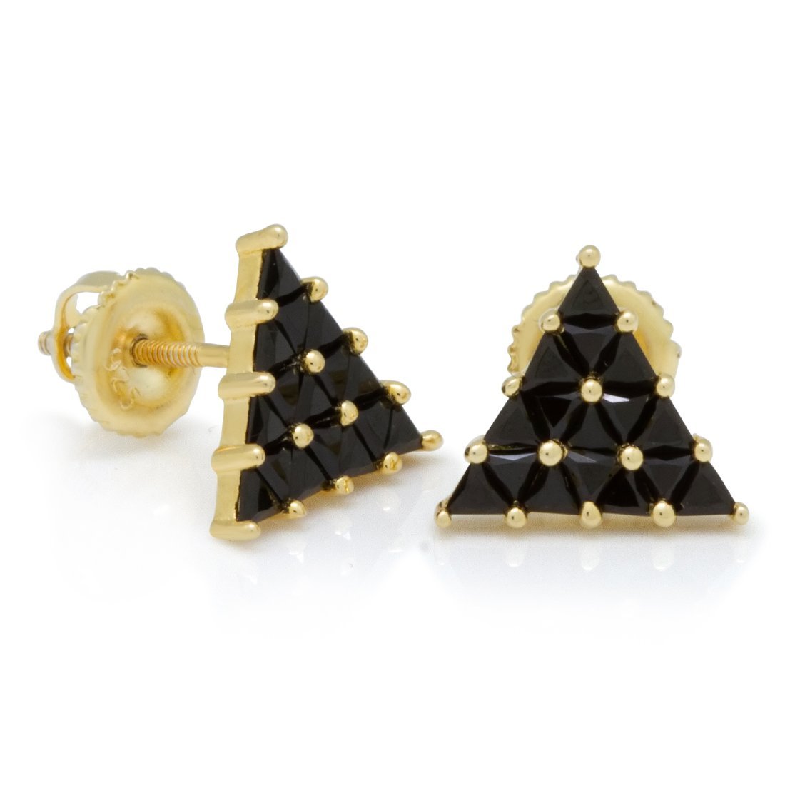 A symbol of geometric perfection, the Trinus takes its inspiration from the All-Seeing Eye. Each pair of .925 Sterling Silver earrings uses trilliant cut onyx handset CZ stones to create its aura of light. The earrings are dipped and plated five times with 14K Gold for a bright finish. The screwback posts provide a sturdy, stable placement and wear.