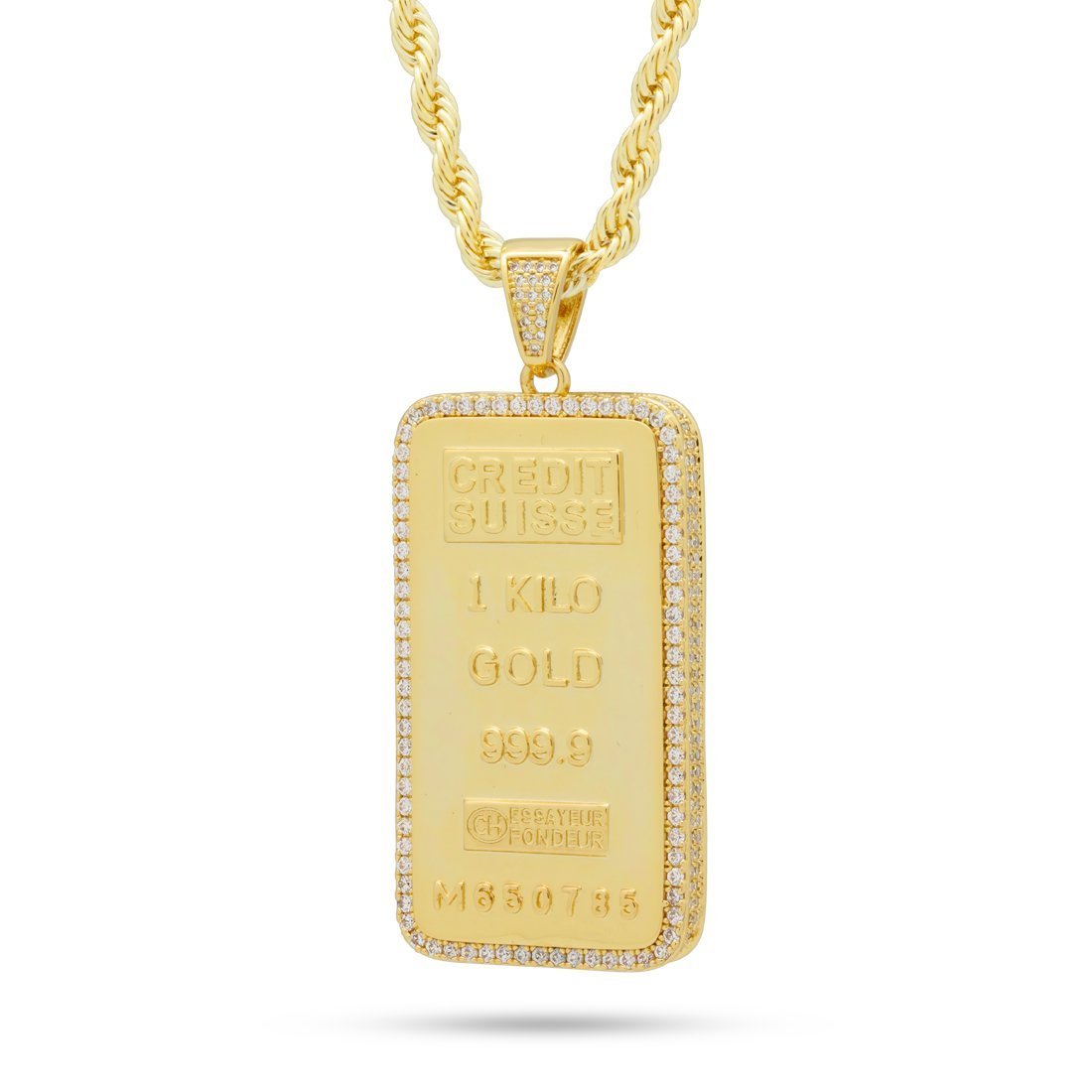Also known as a gold bullion, a 1-Kilo Gold bar is worth thousands in today's market. King Ice has replicated its design with a 14K gold finish and aligned with CZ stones bordering the pendant for a vibrant look. It is paired with a 4mm, 26" Stainless steel Rope chain.