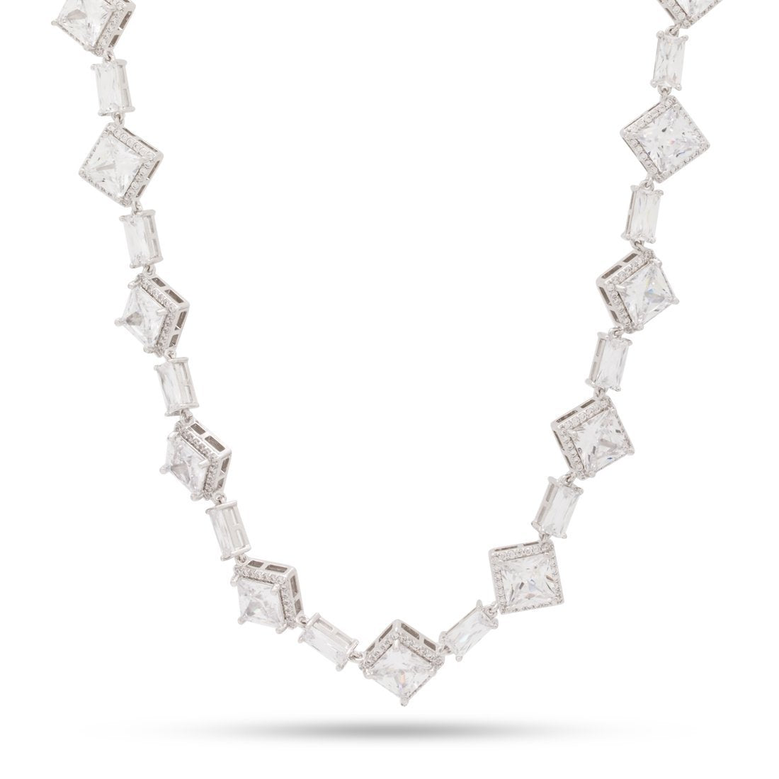 The new Baguette Chain features multiple stone cuts. A large princess cut CZ stone is held by prongs. Following the hallow bridge, round stones border the large one for a brighter finish. Baguette cut stones serve as links for the chain. The chain is available in 14K Gold plating and white gold plating, as well as in different lengths.