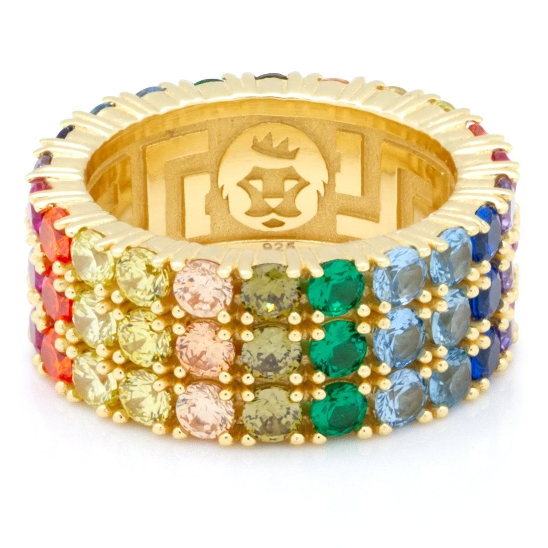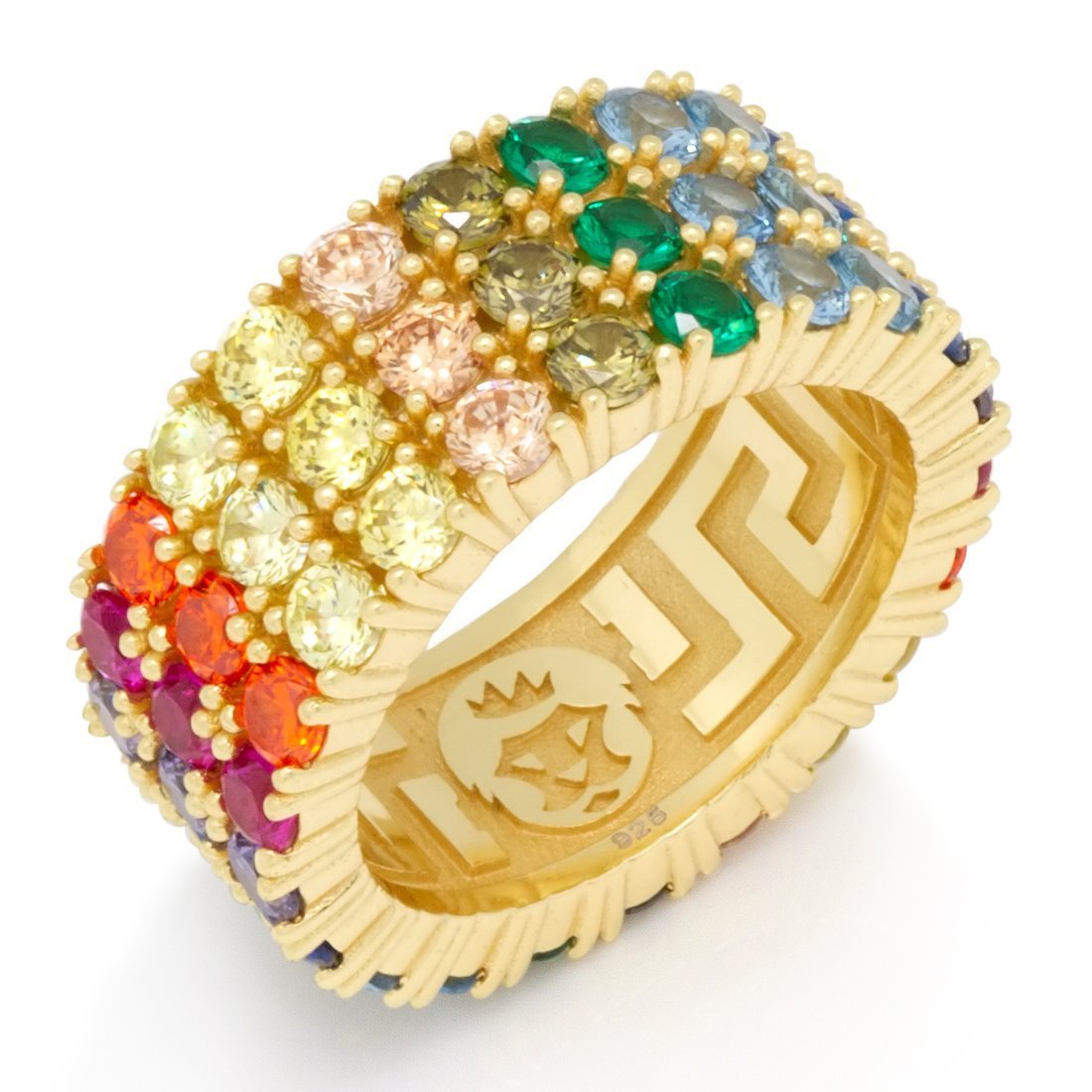 Eleven multicolored VVS Diamond Simulates form the rainbow band on the Triple Row Spectrum Ring. The inside of the 14K Gold plated .925 Sterling Silver ring is engraved with Greek Key for the perfect finish.
