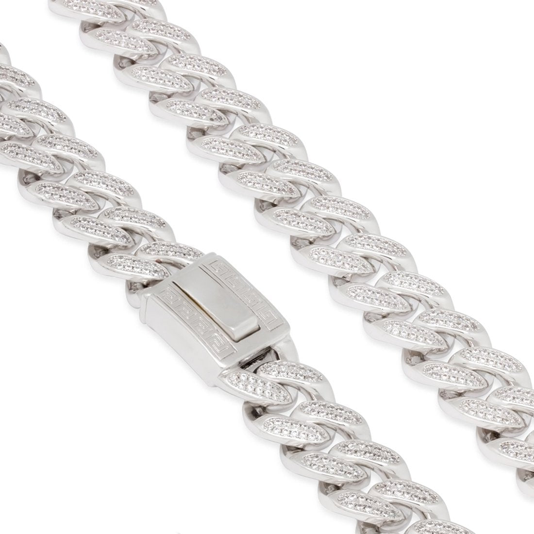 As one of the most recognizable hip hop chain types, the Miami Cuban Curb remains a favorite among recording artists and hip hop fans. Now, you can own this "Flooded" version that features clear CZ stones lined along each curb link to offer a vibrant look to match your lifestyle. With white gold plating, each chain provides an elegant shine to coordinate with 18mm thick links that provide a large, heavy feel for gentlemen after a more eye-catching design. Each chain also includes a clasp that provides a hidden, quick release mechanism that includes an elegant Greek Key design alongside the King Ice name.