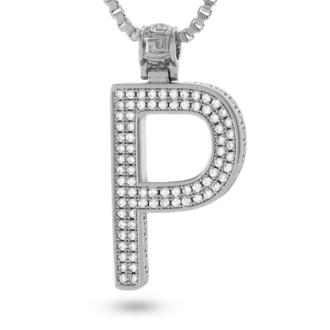 Plated in white gold, each "P" provides a dashing display of streetwear flavor complete with a studded look. Each CZ stone comes hand set along a micro pave setting and finished with a 2mm, 26" box chain.
