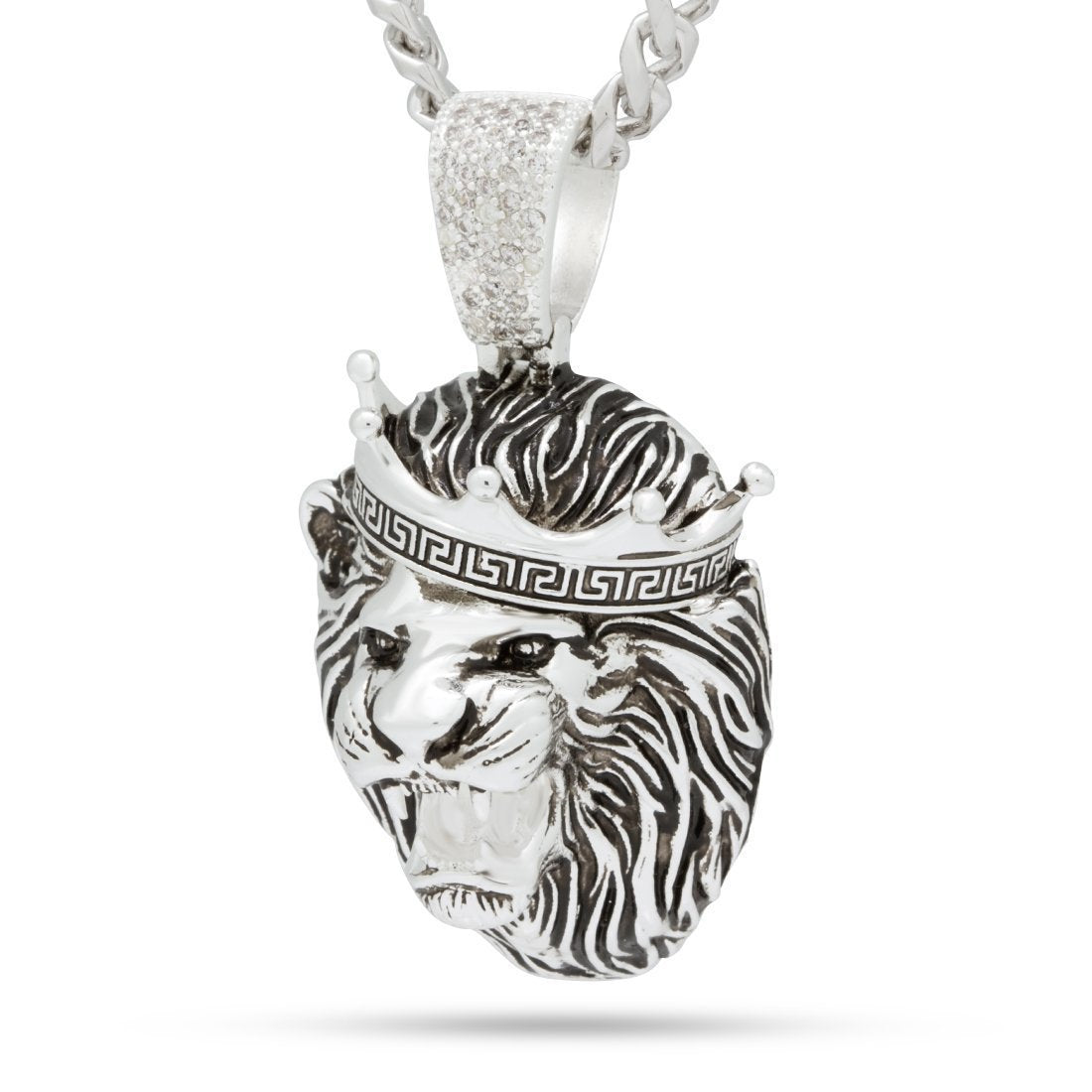 A roaring lion can represent power, strength and majesty. King Ice's XL Antique White Gold Roaring Lion Necklace is the epitome of this representation. The lion's sharp canines pop out with the 3D design. Antique white gold plating decorates the monstrous mane and crown, while VVS Diamond Simulates decorate the thick bale. Each large pendant comes with an 8mm, 20" Miami Cuban Chain.