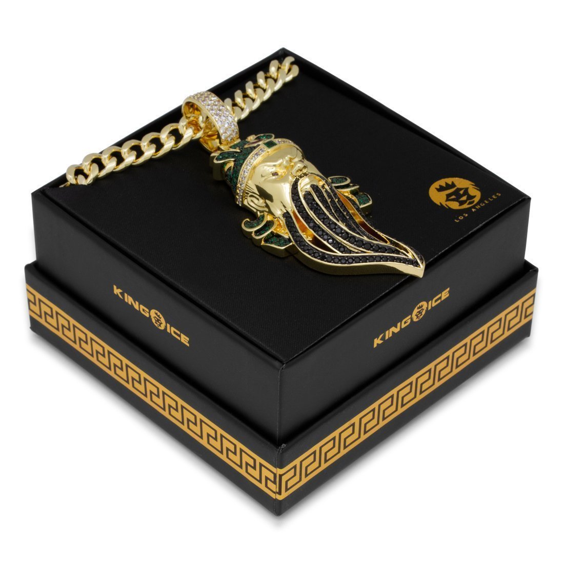Known as the God of War during the Eastern Han Dynasty in China, Guan Yu was a warrior for his people. Many knew him to be courageous, strong and loyal. Each XL necklace is plated with 14K Gold and colorful VVS Diamond Simulates border Yu's design. A red ruby simulate brightens Yu's headwear for extra color. The back of every pendant has "loyalty" and "integrity" engraved in Chinese to complete Guan Yu's necklace. Each comes with an 8mm, 20" Miami Cuban Chain.