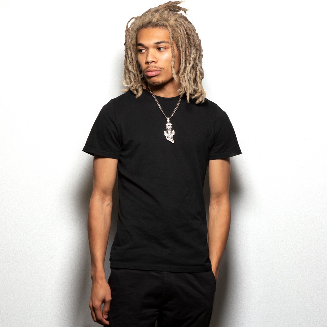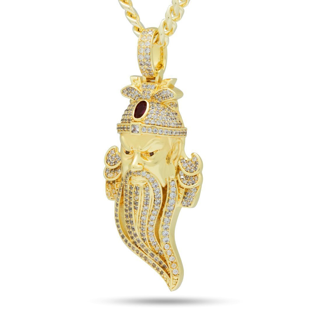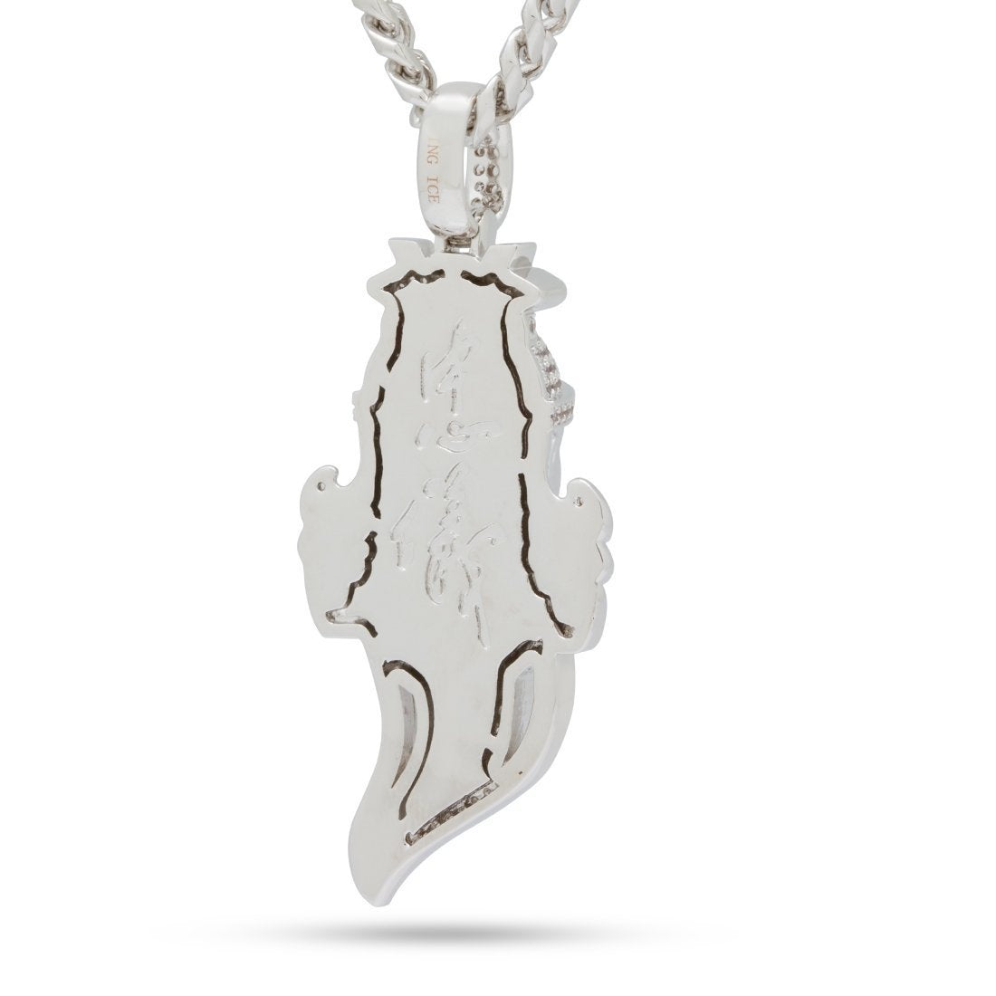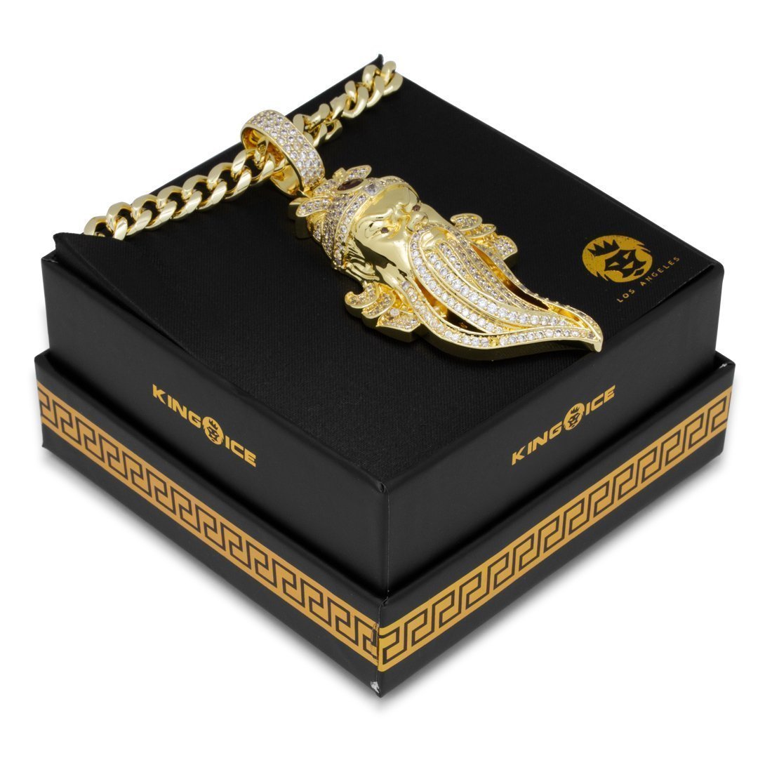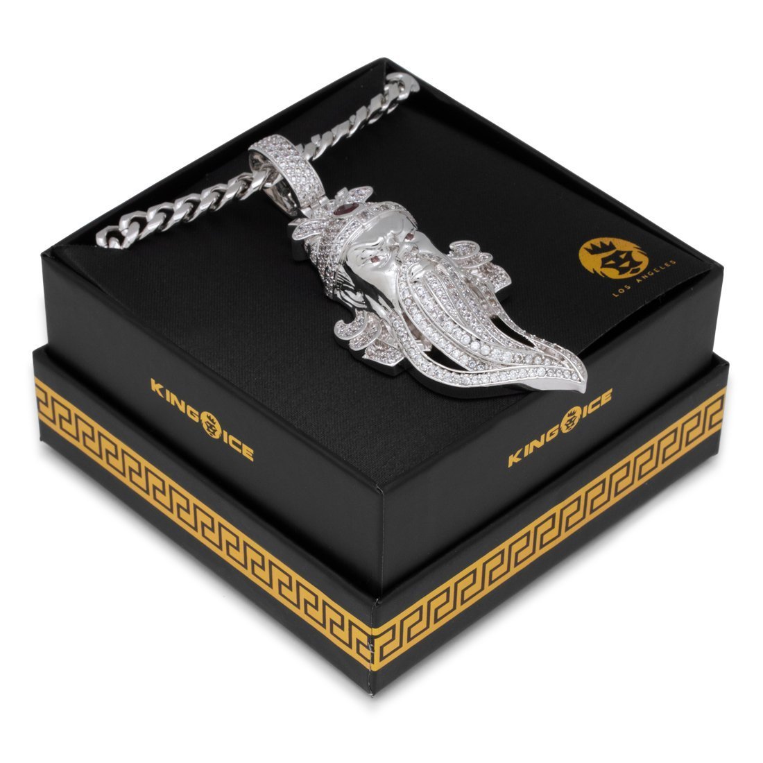 Known as the God of War during the Eastern Han Dynasty in China, Guan Yu was a warrior for his people. Many knew him to be courageous, strong and loyal. Now, King Ice pays tribute with an iced Guan Yu necklace. Each necklace is plated with gleaming white gold and VVS Diamond Simulates border Yu's design. A red ruby simulate brightens Yu's head wear for extra color. The back of every pendant has "loyalty" and "integrity" engraved in Chinese to complete Guan Yu's necklace. Each small necklace is accompanied with a 5mm, 20" Miami Cuban Chain and each large comes with an 8mm, 20" Miami Cuban Chain.